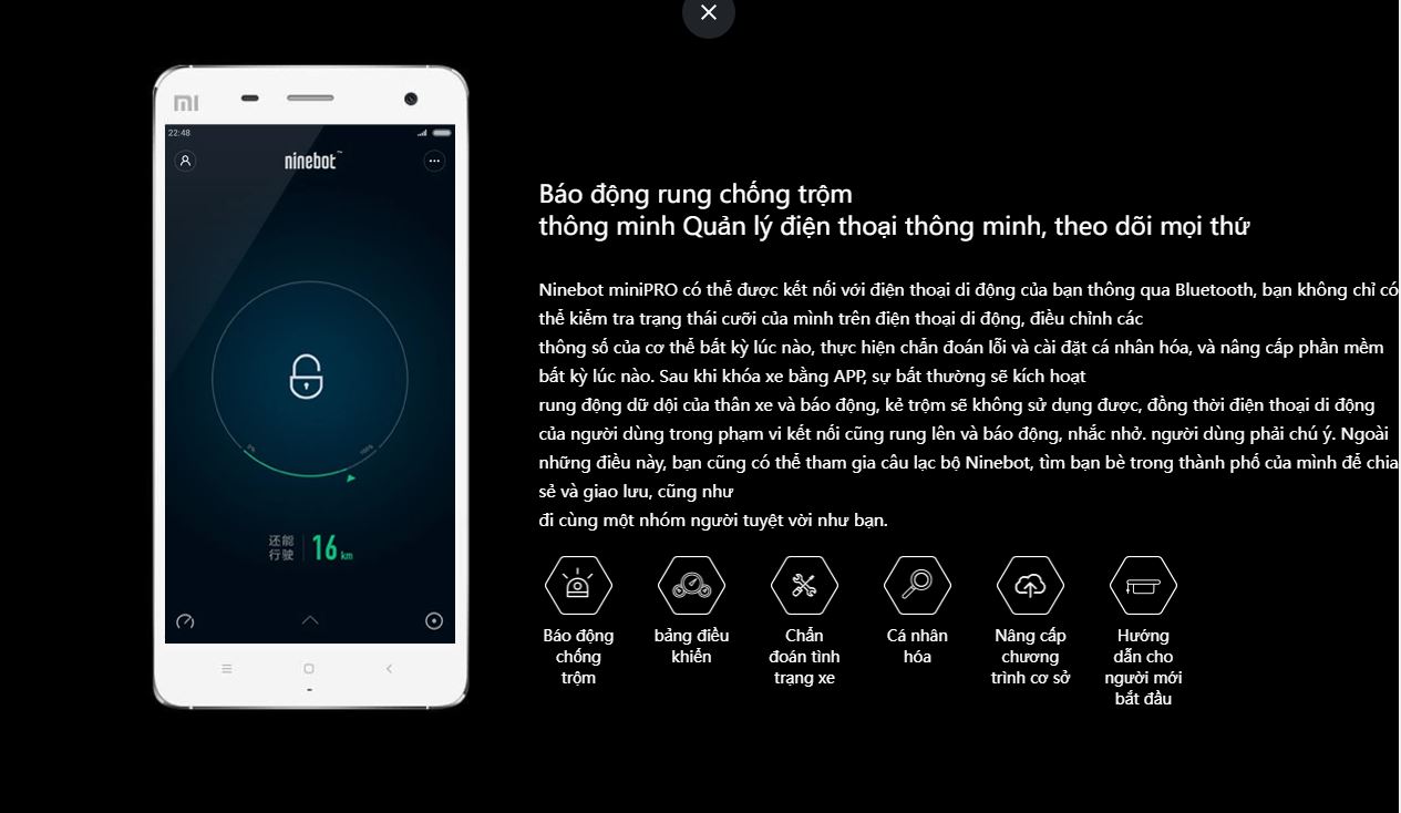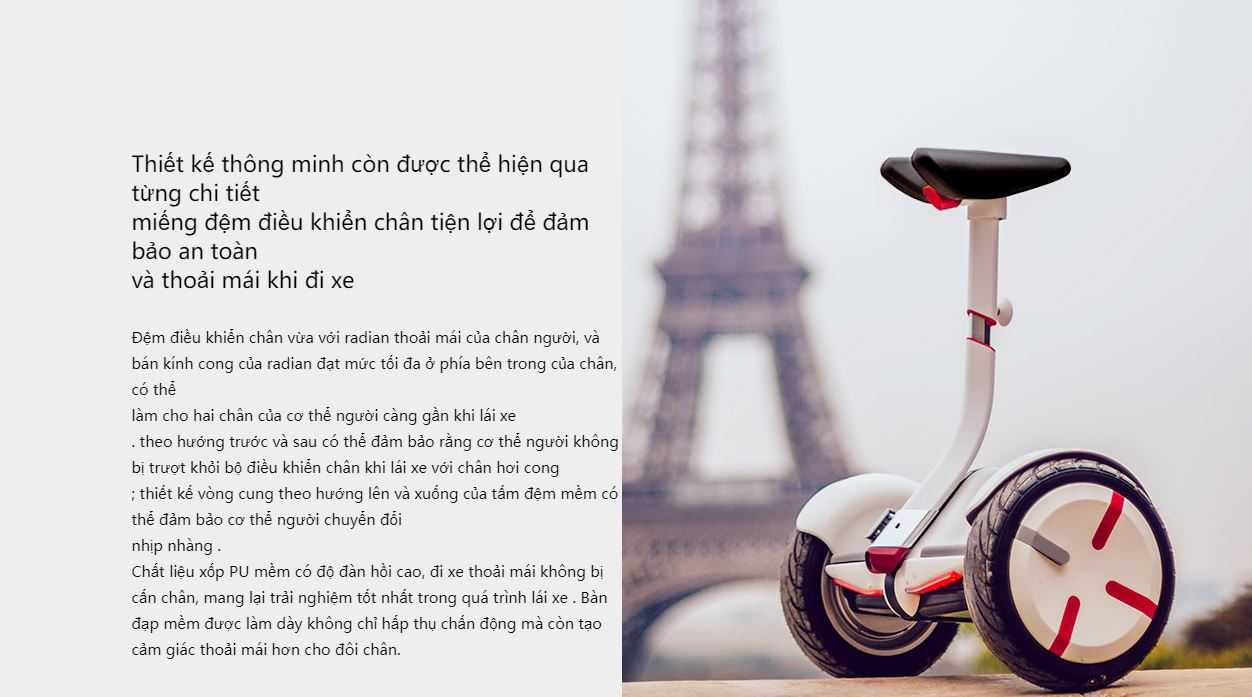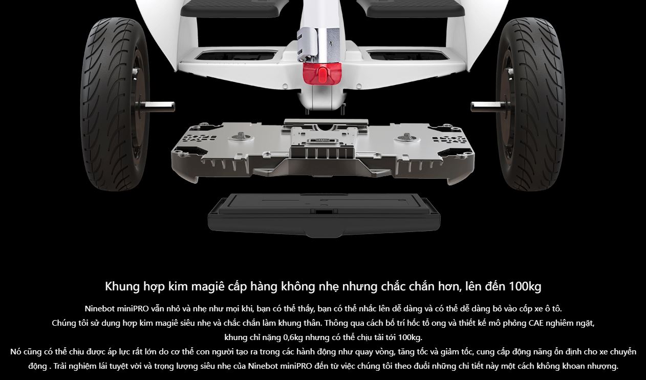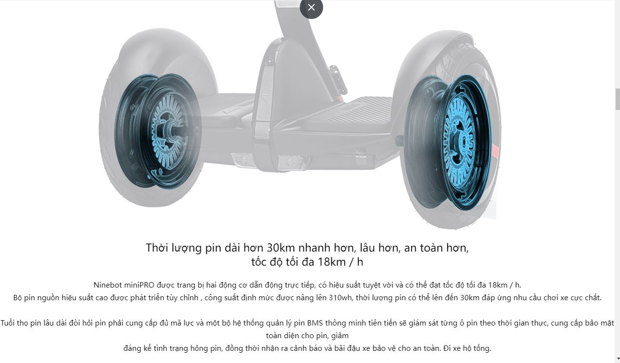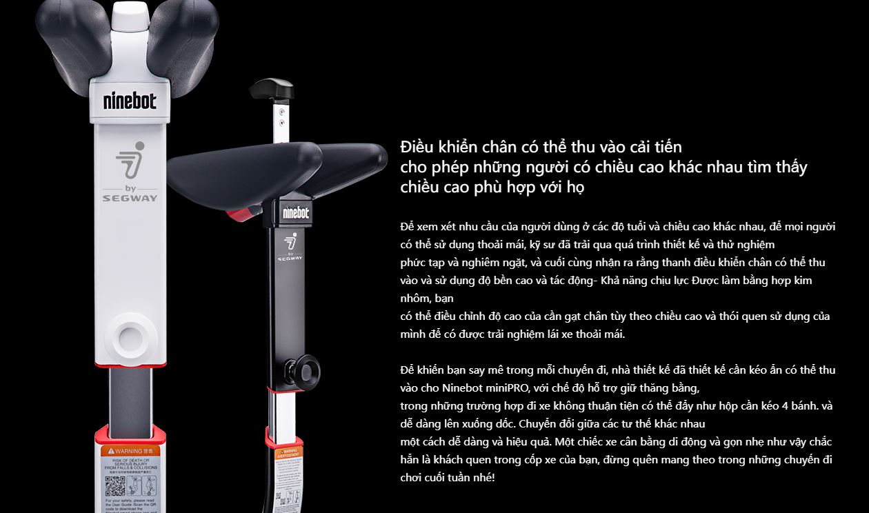Tốc độ tối đa: 18 km / h khoảng cách tối đa: 30 km Pin: 320 Wh Công suất động cơ: 400W x2 Công suất tối đa: 2100W leo dốc tối đa: 15 ° Tải trọng tối đa: 100kg Cần điều khiển chân:Có ốc vặn dưới cần điều chỉnh tăng giảm chiều cao cần và Tiện dụng với một lần nhấp xuống để lấy tay cầm mở rộng để kéo xe giống như kéo vali mà không cần phải sách xe lên như ninebot mini. ![]() |