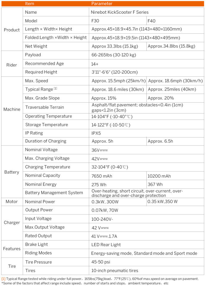 Các mô hình Ninebot KickScooter F30 và Ninebot KickScooter F40 cung cấp năng lượng pin và quãng đường lớn hơn. Ninebot KickScooter F30 có thể chạy trong khoảng cách 30km và Ninebot KickScooter F40 có thể bao quát khoảng cách 40km, với góc đường tốt hơn Ninebot KickScooter F25. Công suất lớn nhất trong mô hình F40, với dung lượng pin là 10Ah và công suất động cơ là 350W.