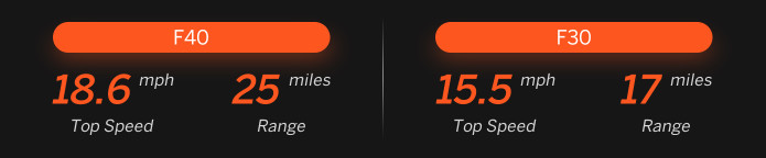 Các tốc độ vượt trội F40 đạt tốc độ tối đa lên đến 30km/giờ. Công suất 350W cung cấp nhiều mô-men xoắn theo yêu cầu, giúp bạn chinh phục độ dốc lên đến 20%