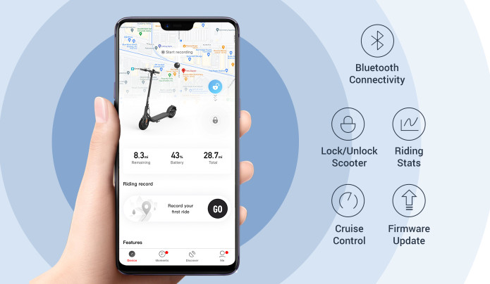 Kết nối Ninebot KickScooter F Series với ứng dụng Segway-Ninebot thông qua Bluetooth để kiểm tra tốc độ cưỡi, mức sử dụng năng lượng và lượng pin còn lại của bạn. Ở tốc độ 5 dặm / giờ, bạn có thể đặt Kickscooter ở chế độ kiểm soát hành trình để có một chuyến đi dễ dàng!
