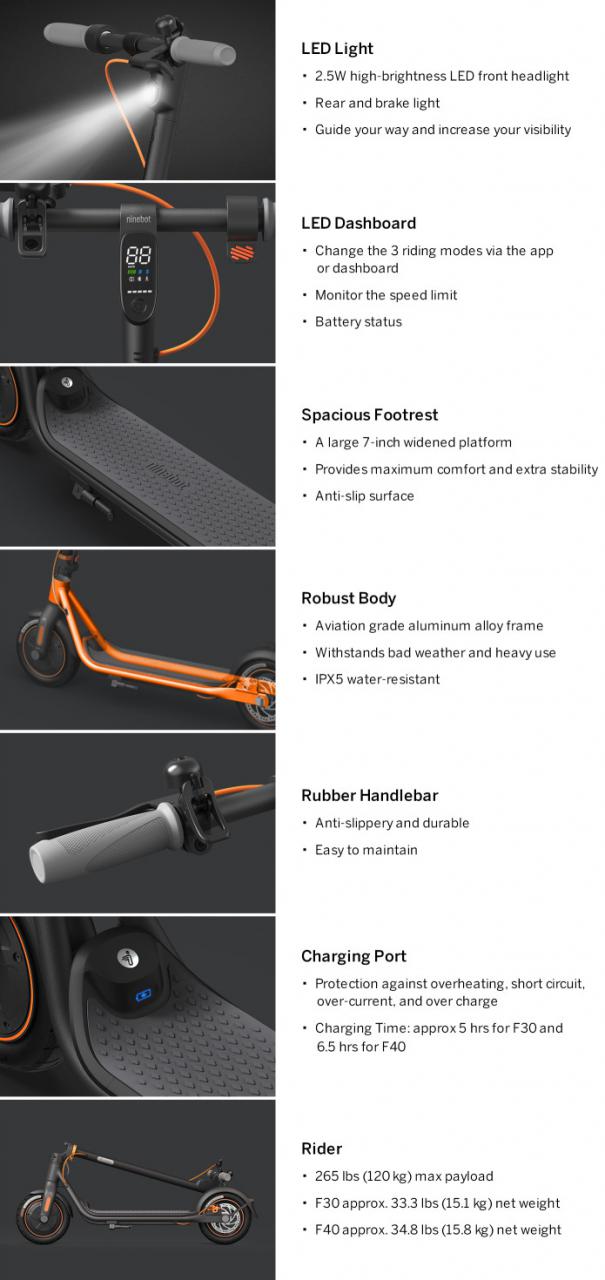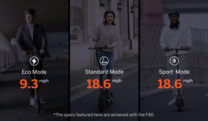 F40 Ninebot được trang bị với một giới hạn tốc độ cài đặt trước 9,3 mph (15 km/h) Eco, 18,6 mph (30 km/h) Tiêu chuẩn, và 18,6 mph (30 km/h) Sport.