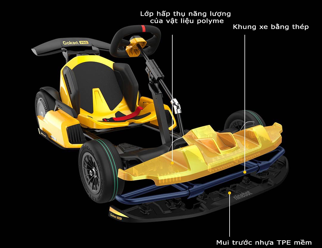 Xe điện Ninebot GoKart Pro Lamborghini sử dụng khung thép cường độ cao với tải trọng hiệu dụng lên đến 100kg, mang lại độ cứng mô-men xoắn tốt hơn và có thể đối phó hiệu quả với các va chạm trên đường ở tốc độ cao.